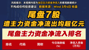 尾盘7股遭主力资金净流出均超亿元