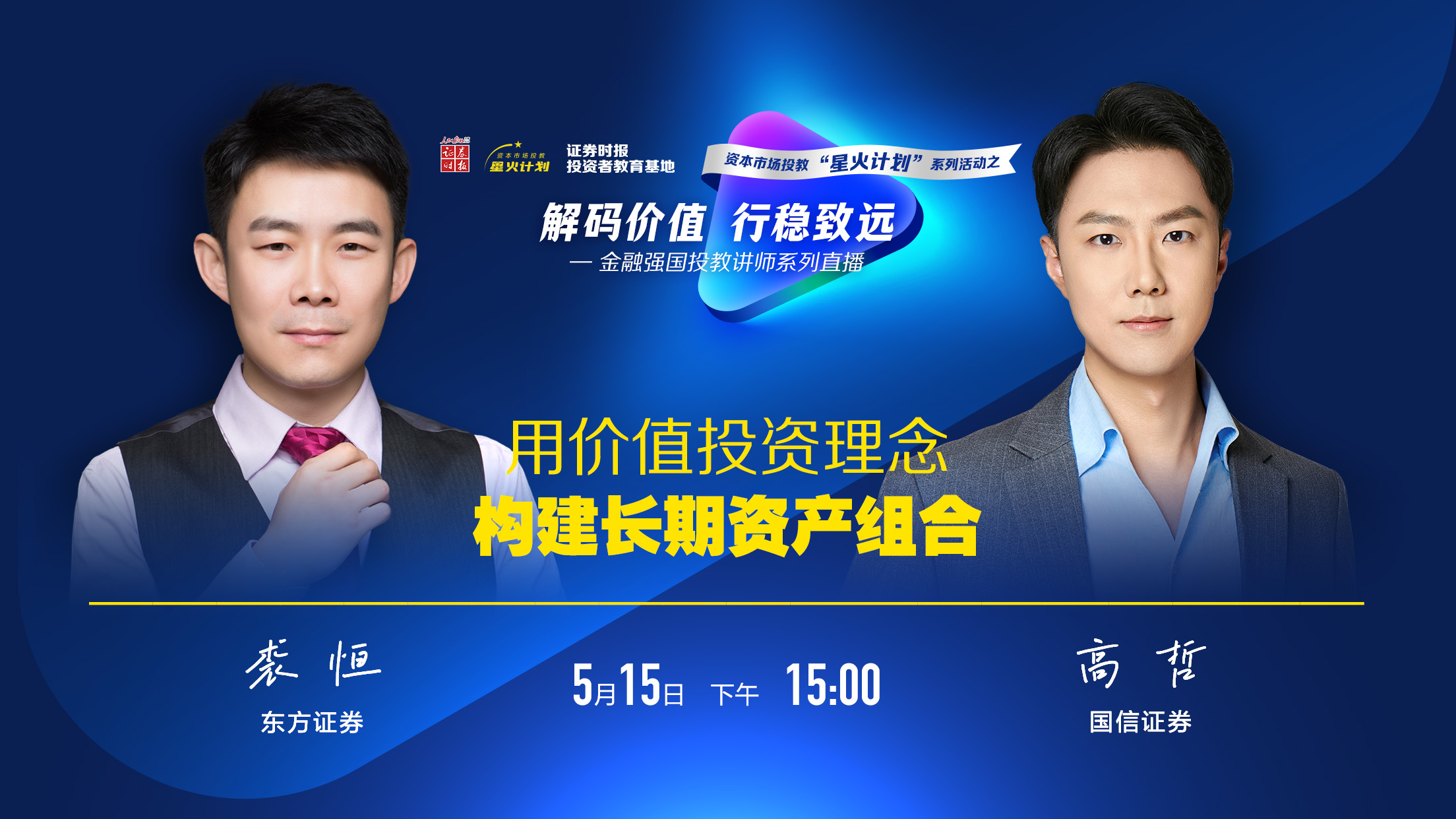 在深交所、上交所、北交所、深圳证监局及中证投服中心的指导下,证券时报推出"坚守价值初心,践行长期投资"资本市场投教"星火计划"系列活动。活动以"五个一"为核心:一场投教作品展播、一周深度直播、一场线下座谈会、一份投教特刊及一个云端投教专题,通过多元立体形式,为投资者打造扎实的知识盛宴。其中,"一周深度直播"以"解码价值,行稳致远"为主题,邀请"金融强国投教讲师库"资深讲师围绕价值投资与长期投资进行系列化深度讲解。5月15日15:00,《用价值投资理念构建长期资产组合》即将开播,敬请关注。