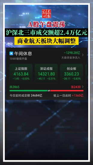 A股午盘震荡,沪深北三市成交额超2.4万亿元,商业航天板块大幅调整