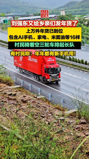 刘强东又给乡亲们发年货了,上万件年货已到位,包含AI手机、家电、米面油等16样