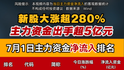 新股大涨超280% 主力资金出手超5亿元
