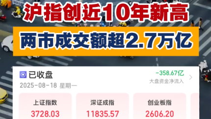沪指创近10年新高 两市成交额超2.7万亿