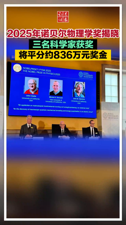 2025年诺贝尔物理学奖揭晓 三名科学家获奖 将平分约836万元奖金