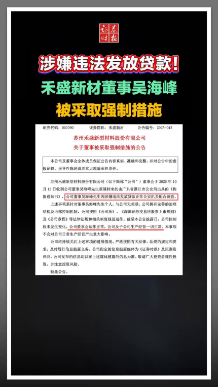涉嫌违法发放贷款!禾盛新材公司董事吴海峰被采取强制措施