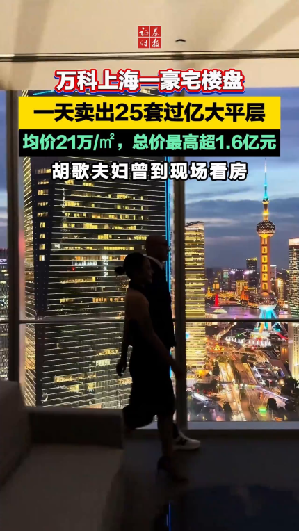 万科上海一豪宅楼盘,一天卖出25套过亿大平层,均价21万/㎡,总价最高超1.6亿元,胡歌夫妇曾到现场看房