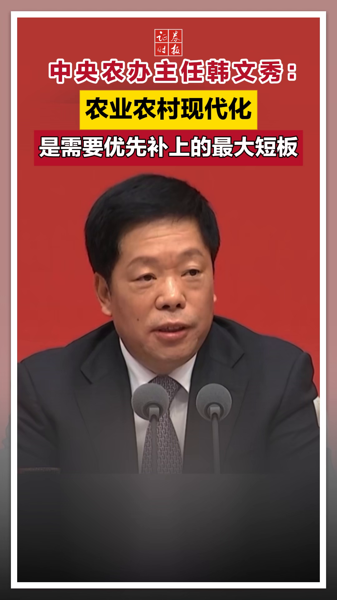 中央农办主任韩文秀:农业农村现代化是需要优先补上的最大短板