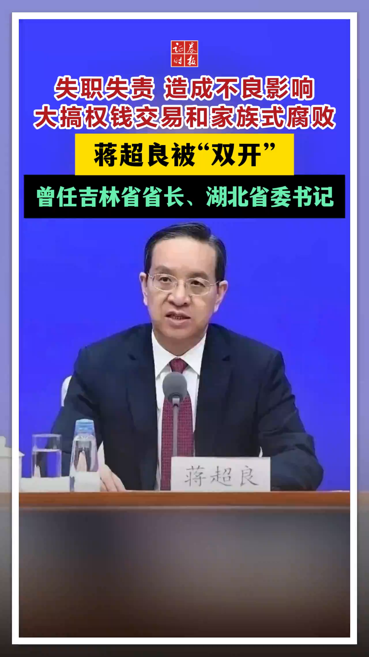 失职失责,造成不良影响 大搞权钱交易和家族式腐败 蒋超良被“双开” 曾任吉林省省长、湖北省委书记
