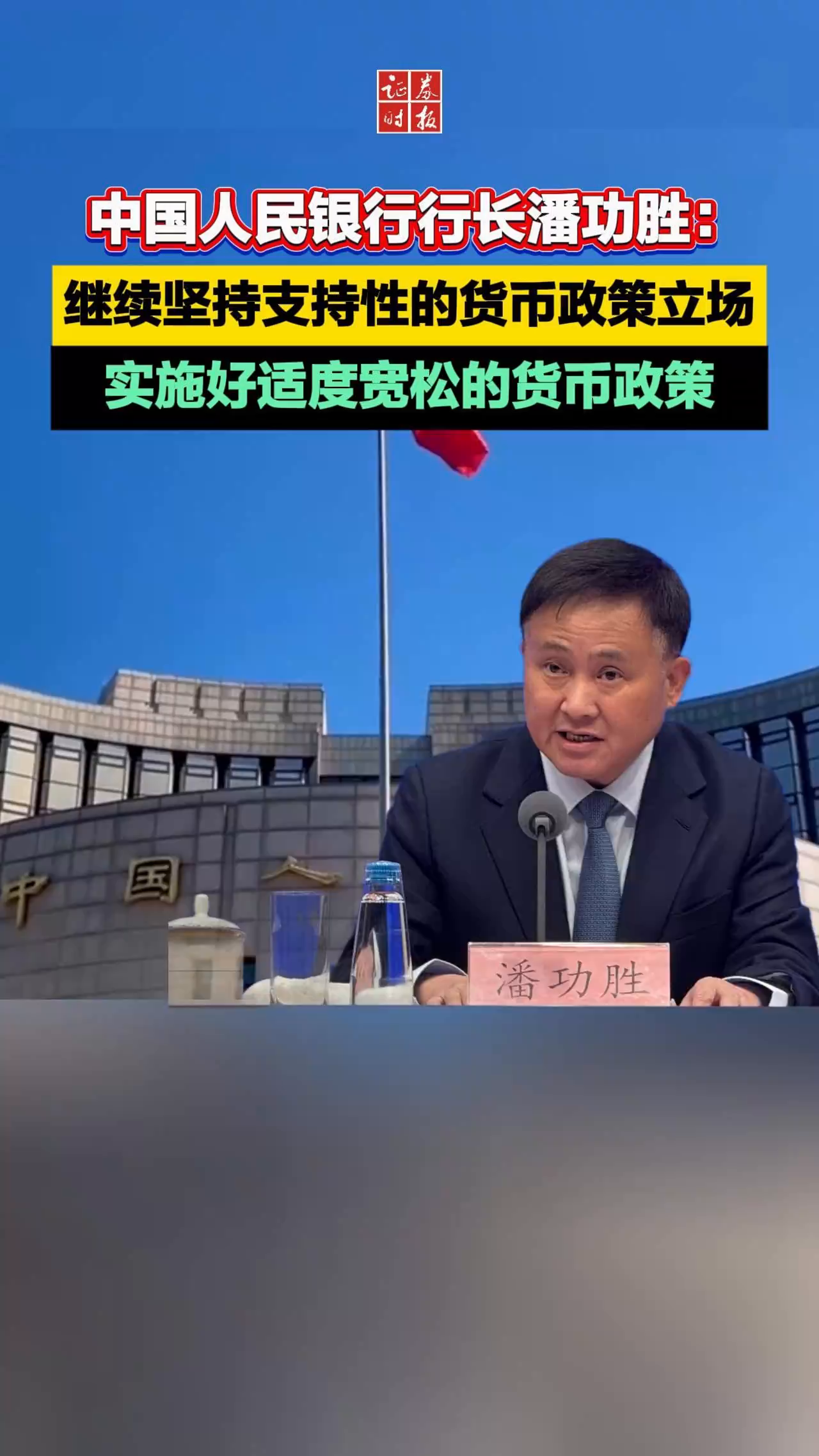 中国人民银行行长潘功胜:继续坚持支持性的货币政策立场,实施好适度宽松的货币政策