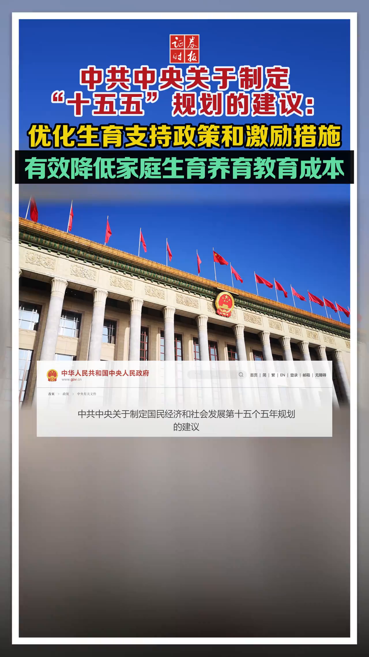 中共中央关于制定“十五五”规划的建议:优化生育支持政策和激励措施,有效降低家庭生育养育教育成本