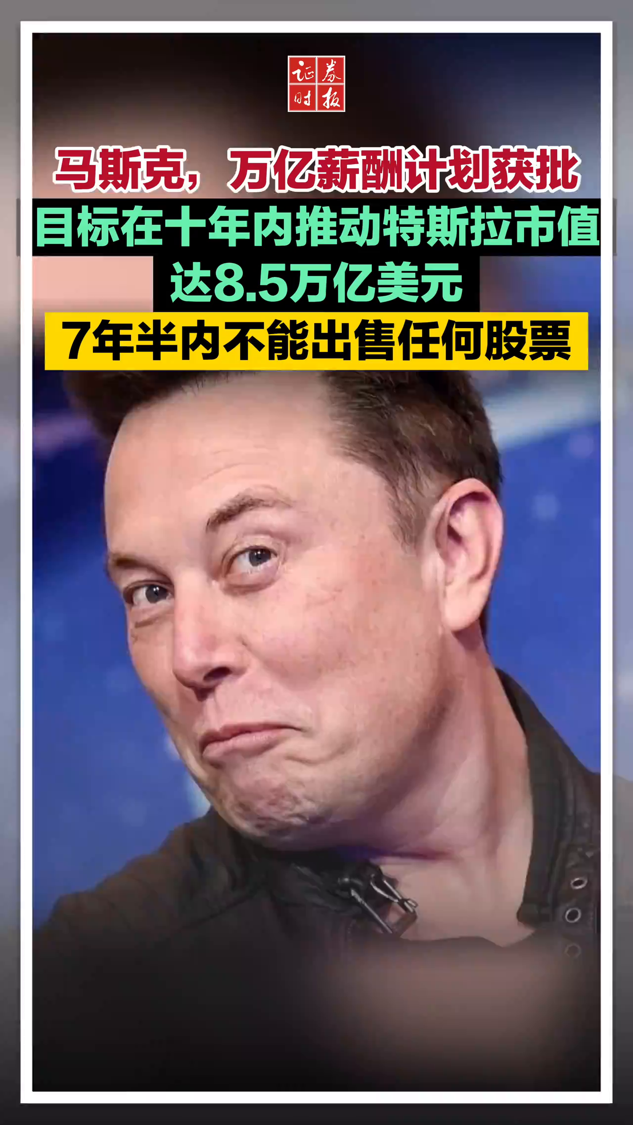 马斯克万亿美元薪酬计划获批 目标在十年内推动特斯拉市值 达8.5万亿美元 7年半内不能出售任何股票