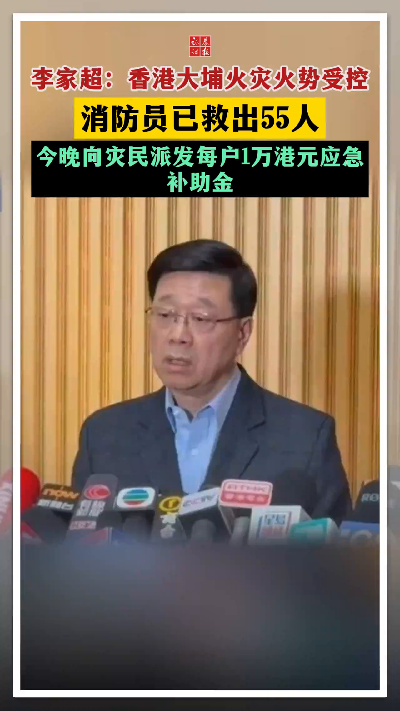 李家超:香港大埔火灾火势受控 消防员已救出55人 今晚向灾民派发每户1万港元应急补助金