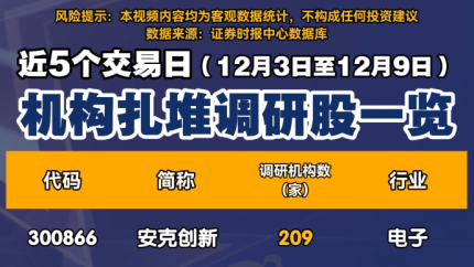 近5个交易日机构扎堆调研股一览(12月3日至12月9日)