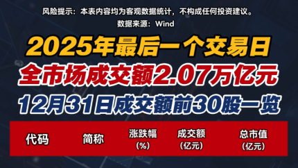 2025年最后一个交易日 全市场成交额2.07万亿元