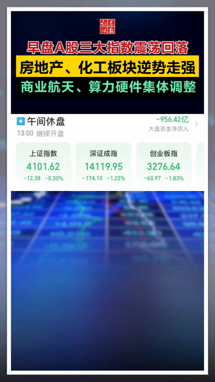 早盘A股三大指数震荡回落,房地产、化工板块逆势走强,商业航天、算力硬件集体调整