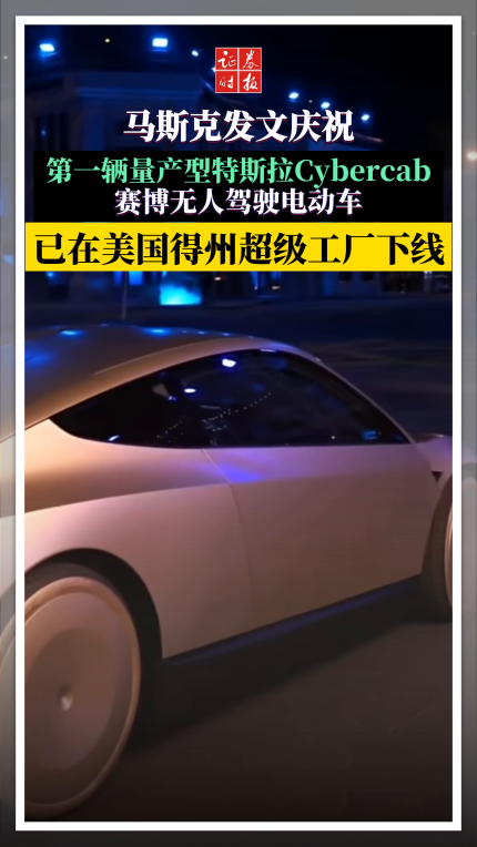 马斯克发文庆祝,第一辆量产型特斯拉Cybercab赛博无人驾驶电动车,已在美国得州超级工厂下线