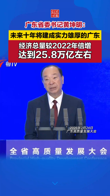 广东省委书记黄坤明:未来十年将建成实力雄厚的广东,经济总量较2022年倍增,达到25.8万亿左右