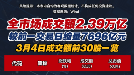 3月4日全市场成交额2.39万亿 较前一交易日缩量7696亿元