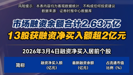3月4日市场融资余额合计2.63万亿 13股获融资净买入额超2亿元