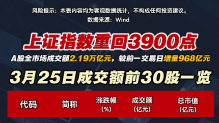 上证指数重回3900点 3月25日成交额前30股一览