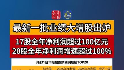 最新一批业绩大增股出炉!17股全年净利润超过100亿元,20股全年净利润增速超过100%!#业绩 #业绩大增 #A股业绩 #净利润大增 #2025年业绩