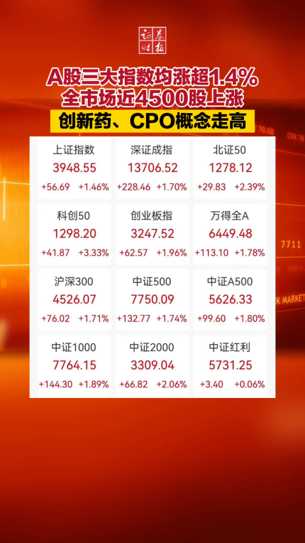 A股三大指数均涨超1.4% 全市场近4500股上涨 创新药、CPO概念走高