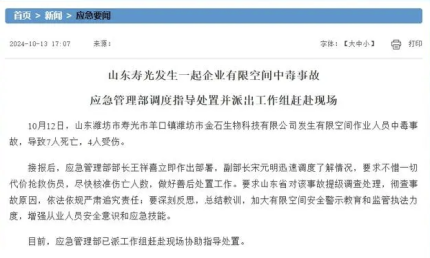 7死4伤!山东寿光一公司发生气体中毒事故 应急管理部入驻调查