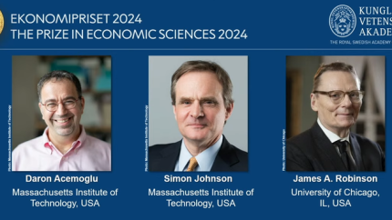 瑞典皇家科学院宣布,将2024年诺贝尔经济学奖授予达龙·阿西莫格鲁、西蒙·约翰逊和詹姆斯·A·罗宾逊。