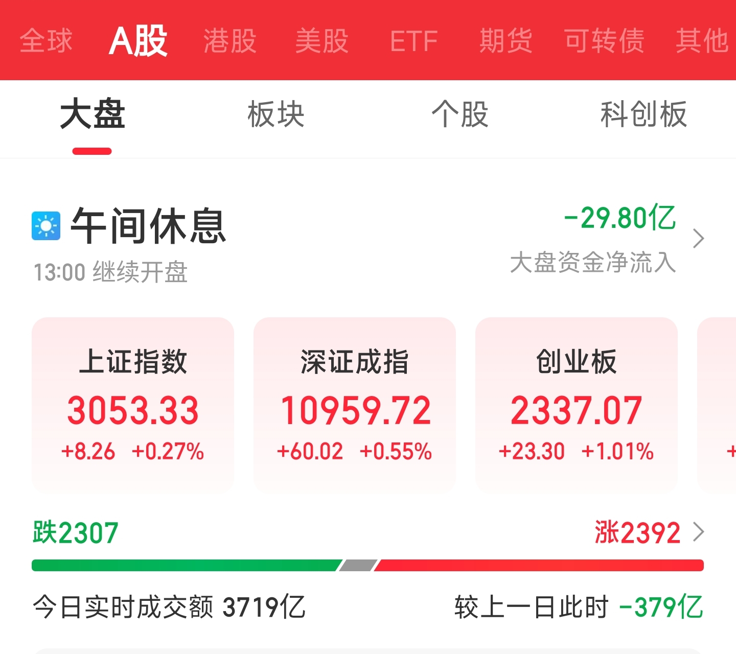 29日,A股三大指数集体高开,此后涨幅收窄。截至午间收盘,上证指数涨0.27%,报3053.33点;深证成指涨0.55%,报10959.72点;创业板指涨1.01%,报2337.07点。沪深两市所有交易个股涨跌比为2392:2307,两市涨停24家,跌停10家。