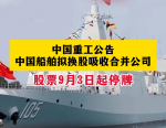中国重工公告,中国船舶拟换股吸收合并公司,股票9月3日起停牌