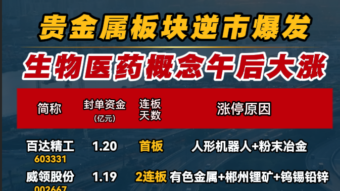 贵金属板块逆市爆发 生物医药概念午后大涨