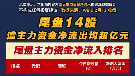 尾盘14股遭主力资金净流出均超亿元