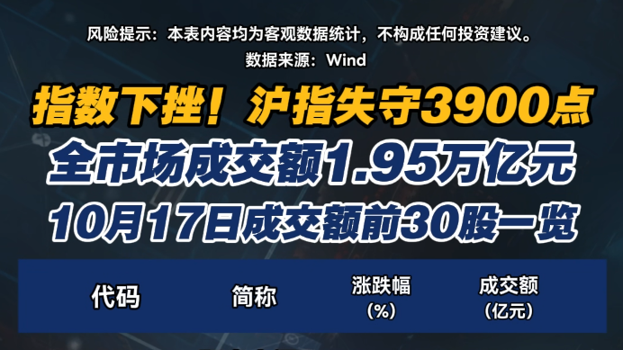 指数下挫!沪指失守3900点 10月17日成交额前...