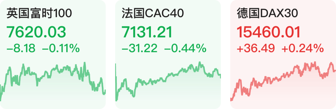 欧洲三大指数涨跌不一。截至收盘,英国富时100指数跌0.11%,法国CAC40指数跌0.44%,德国DAX30指数涨0.24%。
