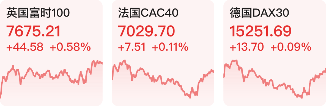 欧洲三大指数全线上涨。截至收盘,英国富时100指数涨0.58%,法国CAC40指数涨0.11%,德国DAX30指数涨0.09%。