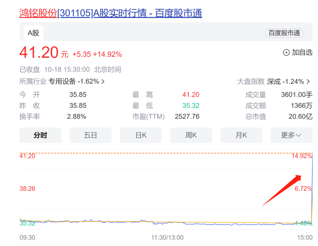 今日,鸿铭股份尾盘股价出现异动,全天大部分时间都处于小幅下跌1%左右的状态,而到收盘集合竞价期间,出现1548手的买单,直线把股价拉至涨14.92%收盘。股价创年内新高,仅比上市首日创造的最高价略低。