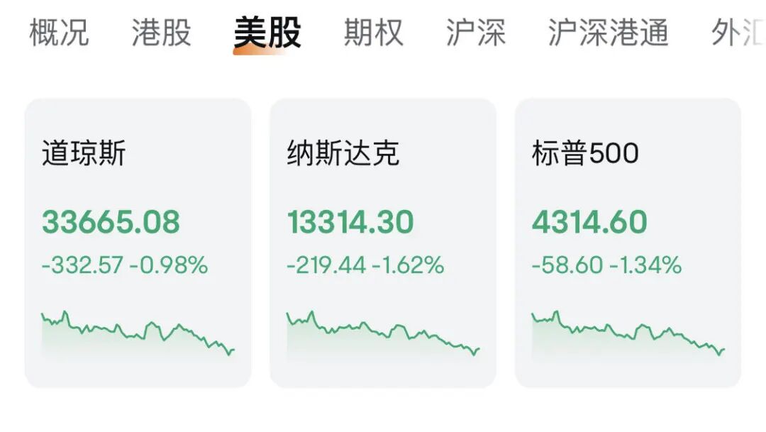 截至收盘,道指跌332.57点,跌幅为0.98%,报33665.08点;纳指跌219.44点,跌幅为1.62%,报13314.30点;标普500指数跌58.60点,跌幅为1.34%,报4314.60点。