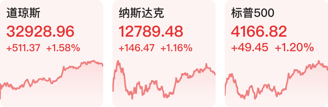 美股三大指数全线上涨。截至收盘,道琼斯指数涨1.58%,纳斯达克指数涨1.16%,标普500指数涨1.2%。大型科技股多数上涨,亚马逊涨超3%,微软涨超2%,苹果、谷歌、英伟达涨超1%,特斯拉逆市跌超4%,股价创5月底以来新低。热门中概股多数上涨,纳斯达克金龙指数涨0.8%。哔哩哔哩涨超4%。