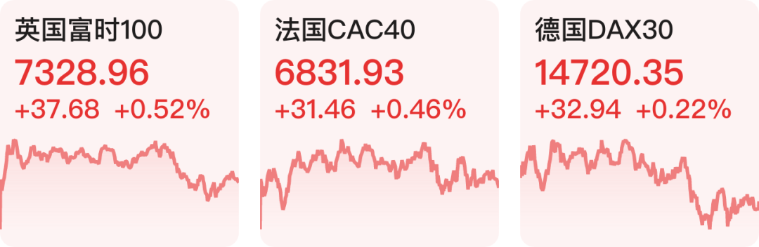 欧洲三大指数全线上涨。截至收盘,英国富时100指数涨0.52%,法国CAC40指数涨0.46%,德国DAX30指数涨0.22%。