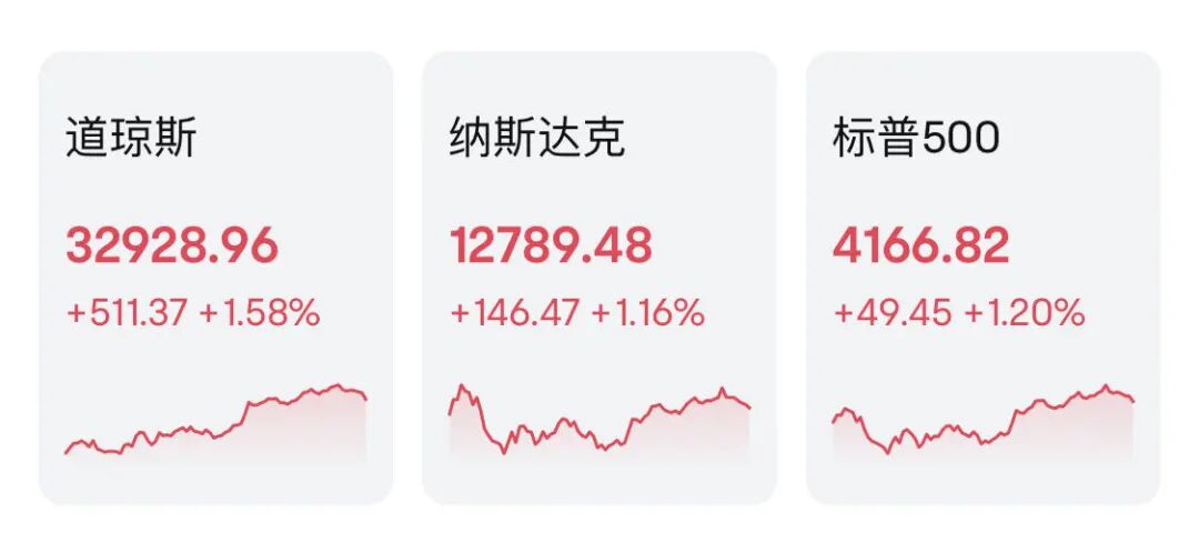 具体来看,道指涨511.37点,涨幅为1.58%,报32928.96点;纳指涨146.47点,涨幅为1.16%,报12789.48点;标普500指数涨49.45点,涨幅为1.20%,报4166.82点。