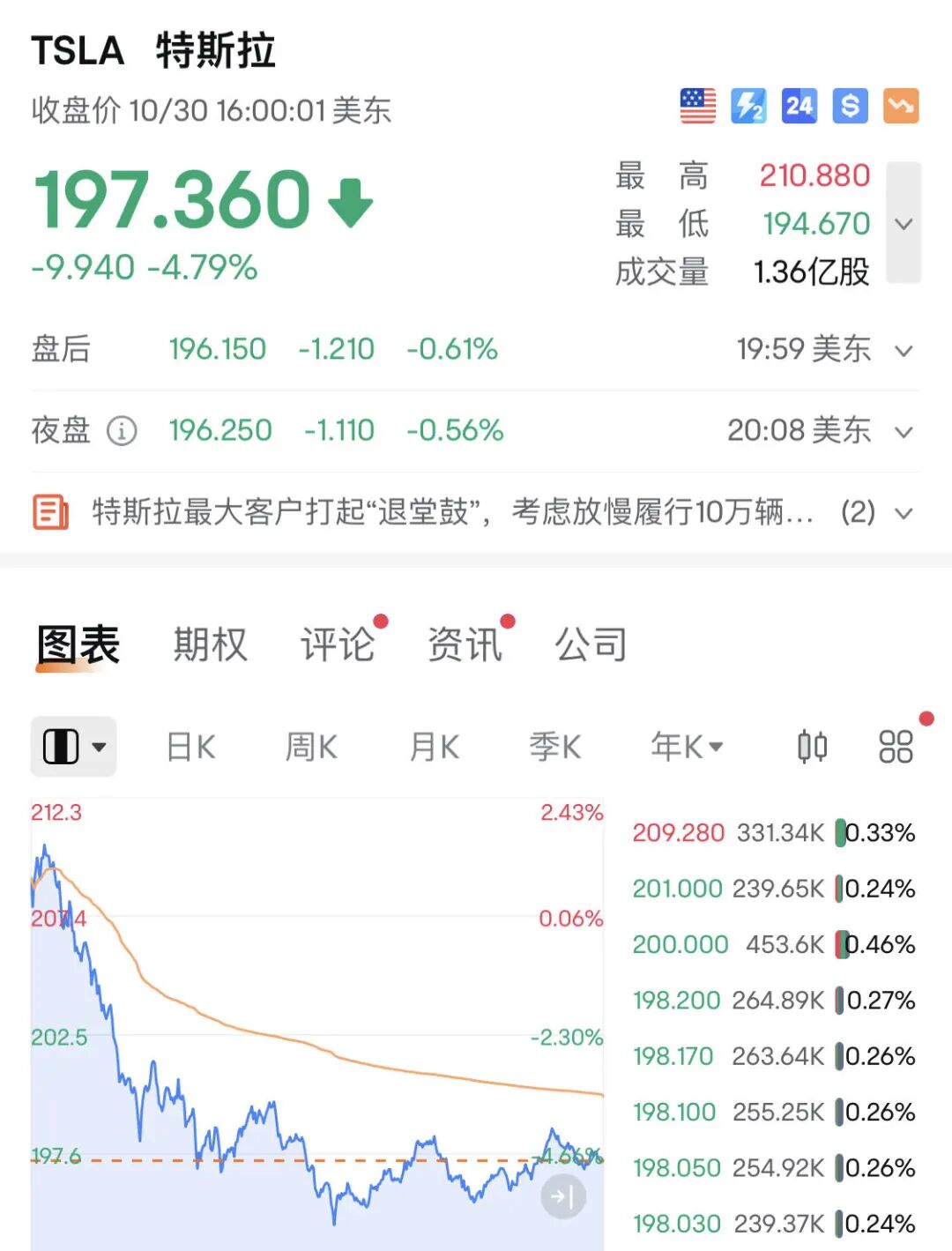 特斯拉收跌4.79%失守200美元,报197.36美元,创近5个月新低,最新总市值为6274亿美元。近日特斯拉官方微博发布消息称,国产Model Y高性能版价格上调1.4万元。市场人士认为特斯拉因利润承压而被迫上调价格,恐影响市场销量。