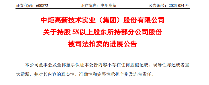 10月31日晚,中炬高新(600872)公告,公司持股5%以上股东中山润田所持有的非限售流通股600万股被司法拍卖,占公司总股本的0.76%。