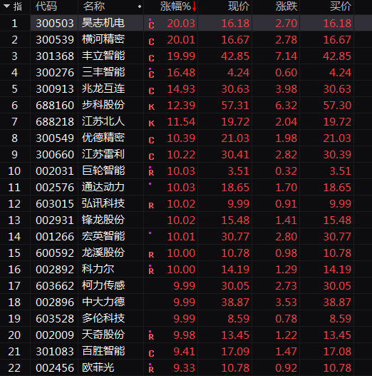 机器人概念早间放量高开高走,板块指数大涨逾3%,创近1个月来新高,半日成交接近上一交易日全天成交。个股掀起涨停潮,昊志机电、横河精密、丰立智能等多股20%涨停,三丰智能、宏英智能、科力尔等近20股涨停或涨超10%。