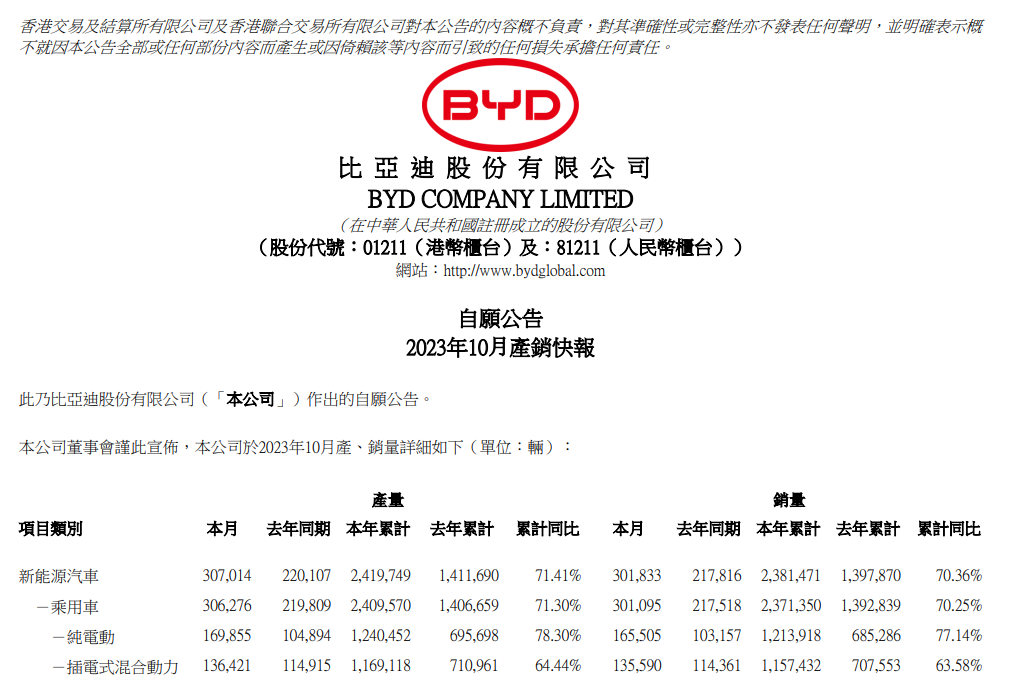 在各大新势力公布交付数据的同时,11月1日晚间,比亚迪公布了10月产销快报。比亚迪股份公告,2023年10月新能源汽车销量30.18万辆,上年同期为21.78万辆;本年累计销量为238.15万辆,同比增长70.36%。