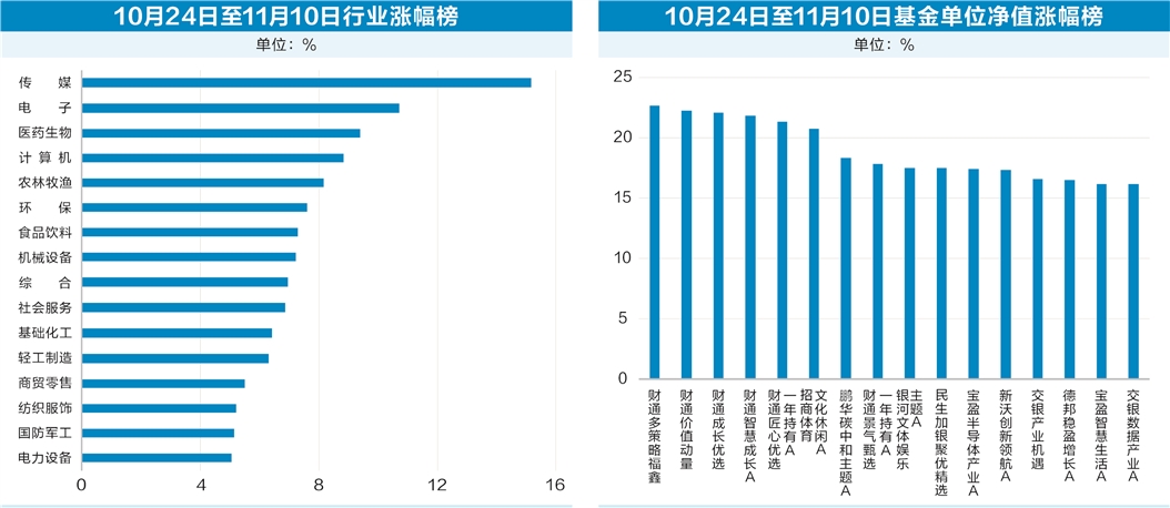 自10月23日下探至年内低点后,近期上证指连续3周走高。10月24日至11月10日,上证指数单边上行,累计涨幅3.39%,深证成指上涨5.86%,创业板指上涨7.52%。