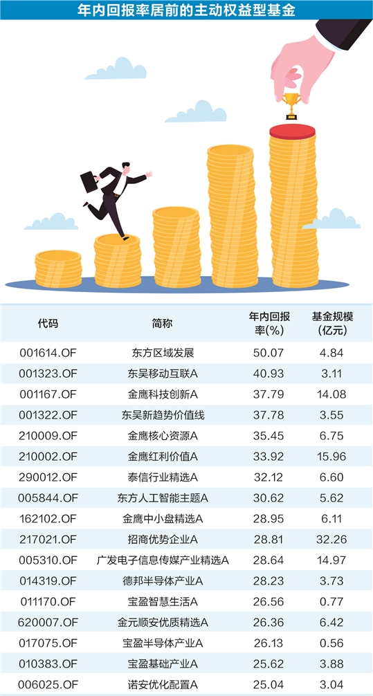 数据宝统计,截至11月10日,在主动权益型基金产品中,表现最好的是东方区域发展,年内回报率高达50.07%,也是唯一一只回报率超过50%的基金;第二名是东吴移动互联A,年内回报率40.93%;第三至第五位分别为金鹰科技创新A、东吴新趋势价值线、金鹰核心资源A,年内回报率均在35%以上。