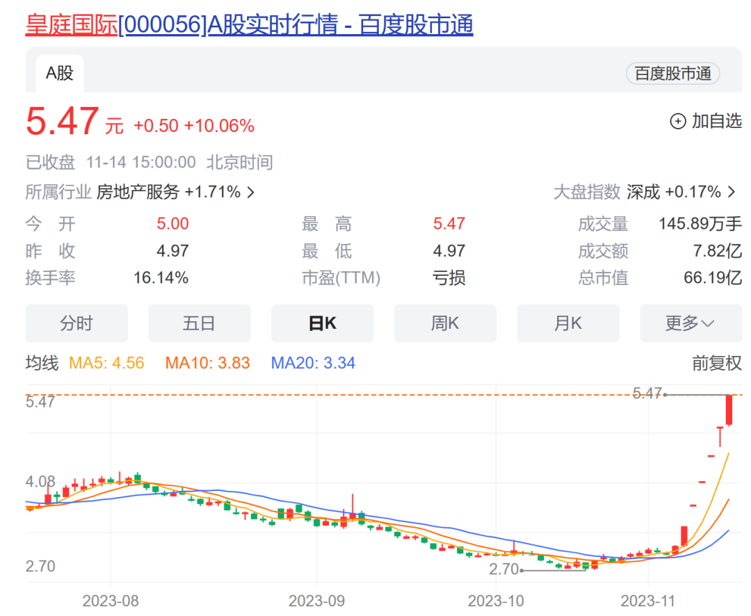 11月6日以来,皇庭国际股价在7个交易日内累计涨幅达到85.42%,成为近期备受关注的热门股票。