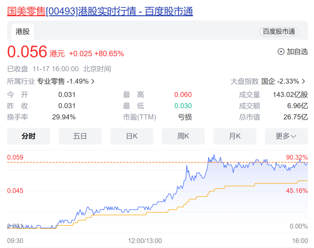 11月17日,昔日的零售巨头国美零售(00493.HK)股价出现大幅异动。尤其是午后,随着成交量急剧放大,该股股价大幅飙升,盘中涨超90%,创出近年来该股单日涨幅最高纪录,最终收盘涨80.65%,报收0.056港元每股,成交量143亿股,换手率近30%。