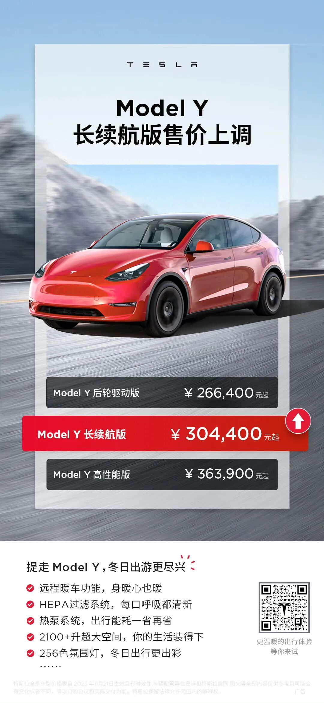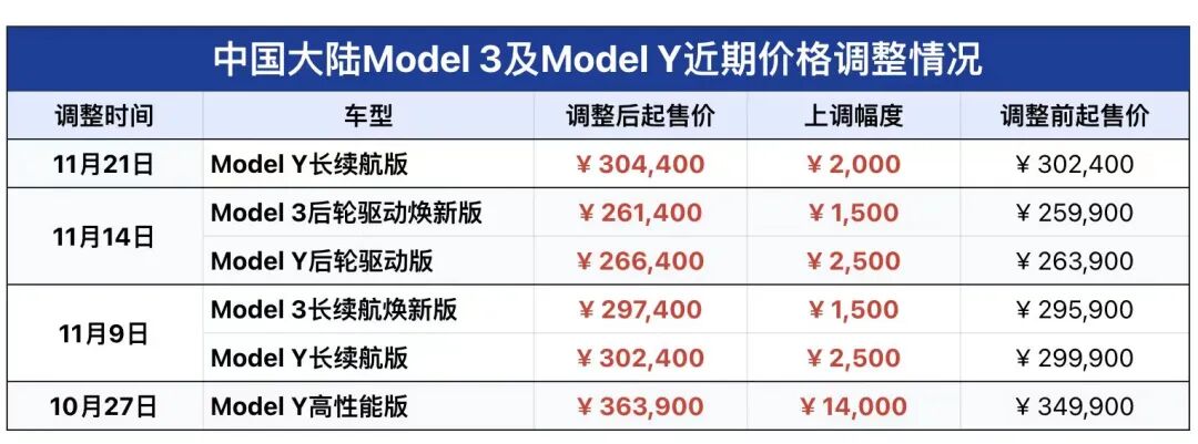 不到一个月,特斯拉迎来第四次价格调整。11月21日,特斯拉中国官网上调Model Y长续航版售价,涨幅2000元,调整后起售价为30.44万元。
