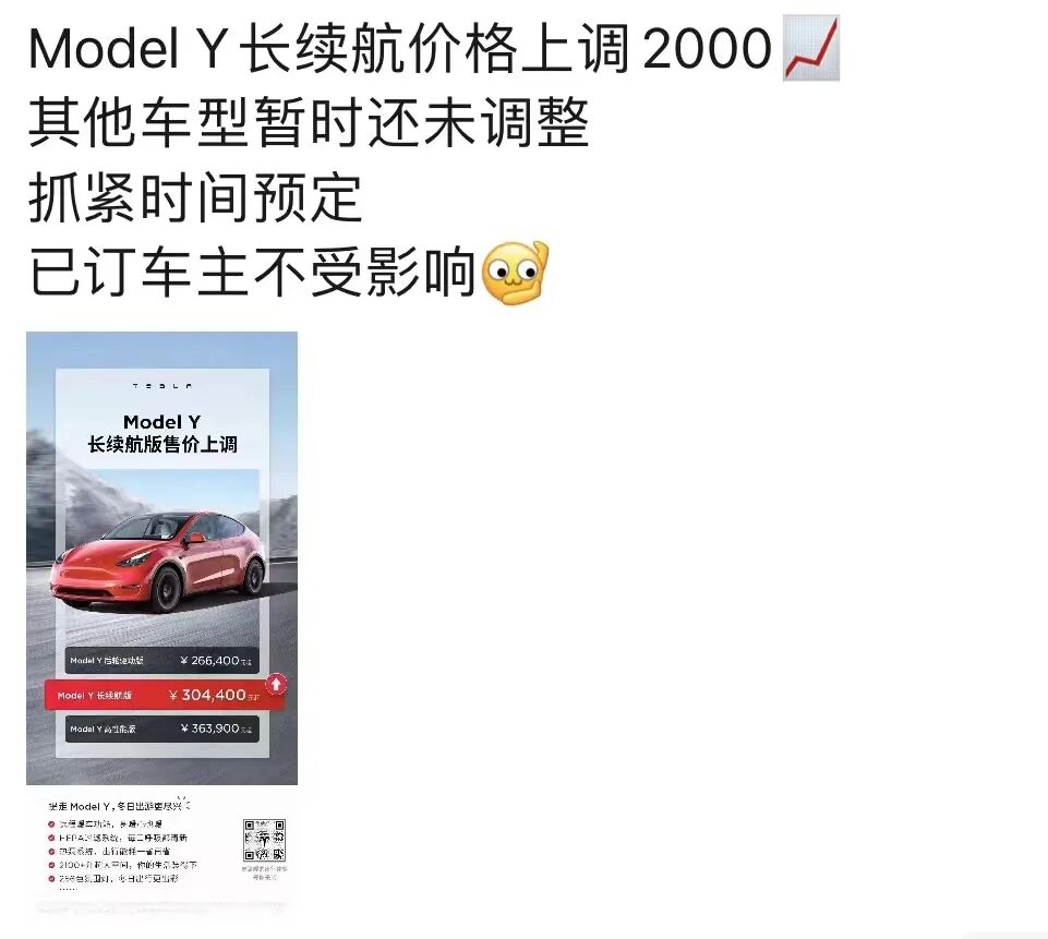 而在涨价官宣后,有销售立刻发布朋友圈文案:长续航价格上调2000元,其他车型暂时还未调整。抓紧时间预订,已订未提的车主不受影响。特斯拉的这种“挤牙膏式”涨价,也被外界解读为“冲销量、刺激成交”。