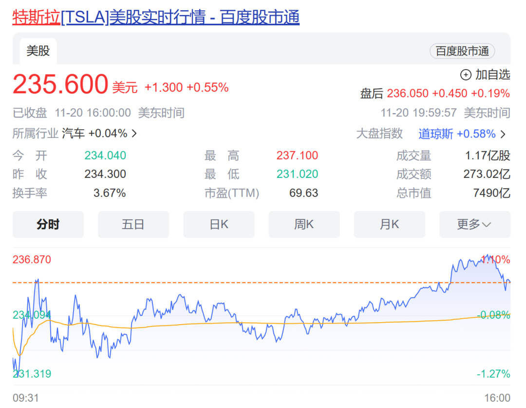 11月21日,截至美股收盘,特斯拉报收235.60美元,涨0.55%,总市值7490亿美元。